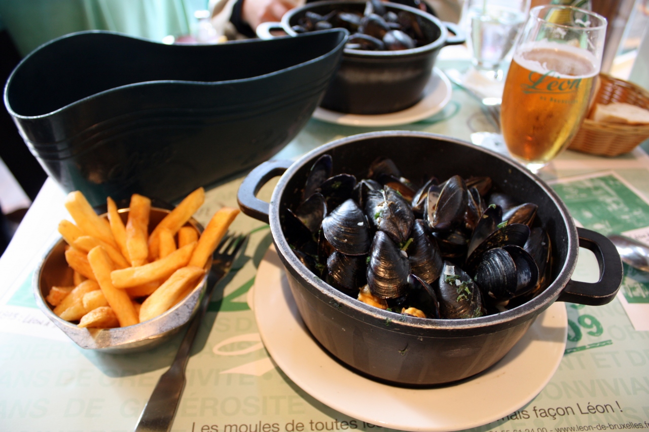 定番メニューの蒸しムール貝は,普通のが14.5ユーロ,カレー味が15.7ユーロです。フライドポテトとパンが付いています。