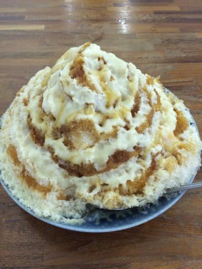 山のようなかき氷に黒蜜と練乳がかかっていて、氷を掘っていくと…