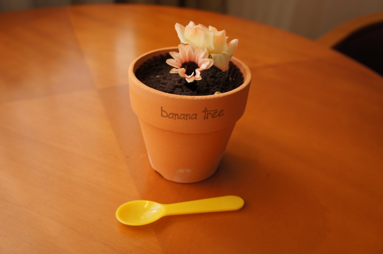 プリンの上に土に見立てた砕いたクッキーが乗っていて、
