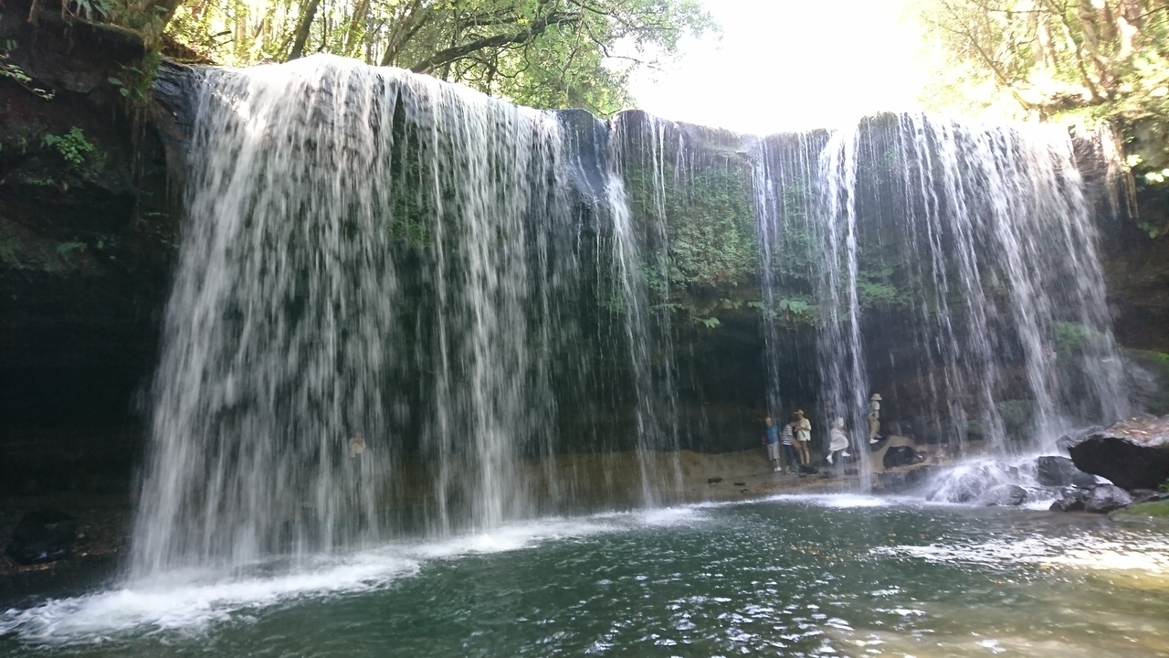 駐車場から階段を下っていき、まずは真正面から滝と対面します。その後、横側から入っていけば、滝の裏側に着き、そこから滝を眺めることができます。