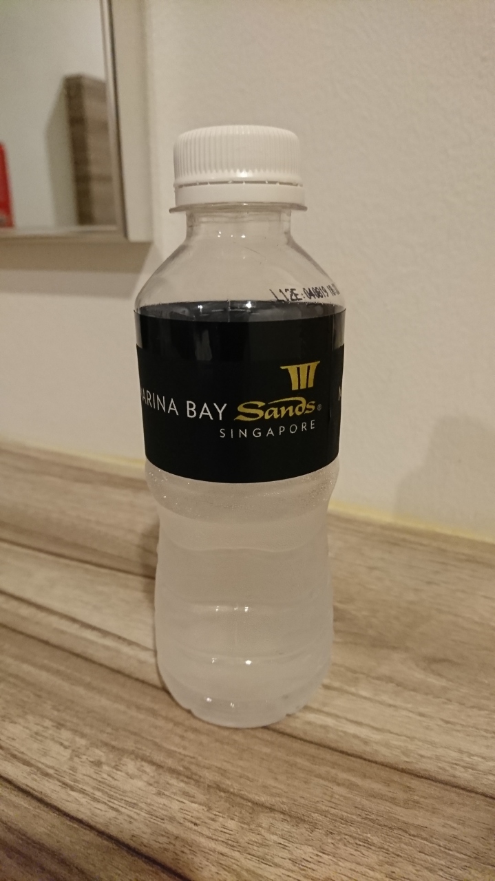 飲み物は自由にいただけ、ミネラルウォーターはマリーナベイサンズのロゴが入っています。