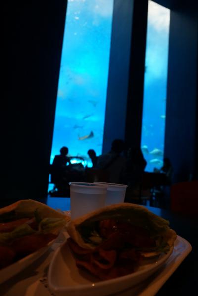 ゴールデンウィークの真っ最中、しかも子供が無料の日に行ったので、なかなか混んでいて空いてる席を探すのも大変でしたが、いざ座ってしまえばブルーの海を前にしてご飯を食べることができ、海外のリゾートとかでレストランに大きい水族館があったりしますが、それに似たような気分が楽しめます。