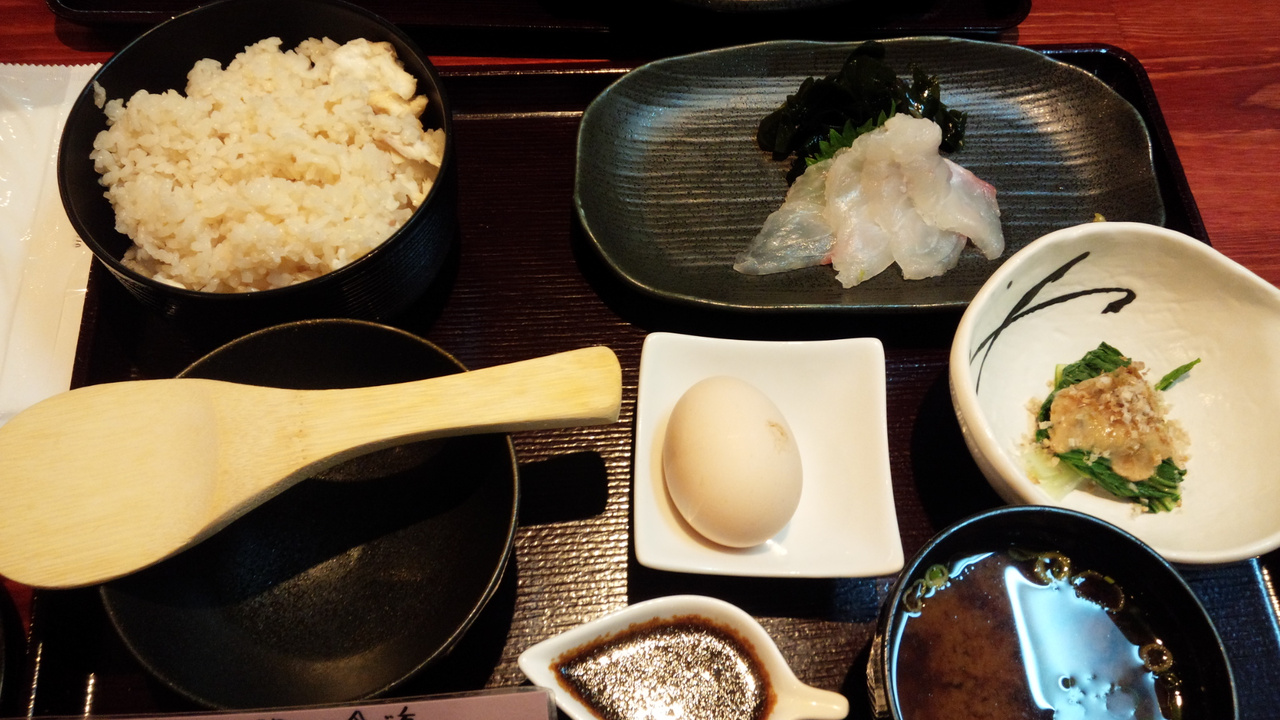 鯛めしを食べましたが、半分はそのままの素朴な味わいを楽しみ、残りは特製の醤油とともに卵かけ鯛めしとして楽しみました。