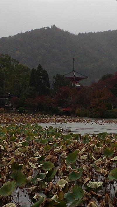よくガイドブックとかに載っている塔(心経宝塔というらしいです)は建物やお庭から見ることができず、入口の右手にあった狭い通路から入り、大沢池をつたっていると、向こう岸に見ることができました。- 旅行時期