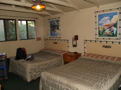 泊まったのはバス・トイレなしのウッドキャビン、思ったほど悪くなかったです。直接予約しましたが、日本の旅行会社経由だと1.5倍ほどの値段だったとおもいます。食事は、バフェが朝10ドル、夕15ドルほどだったですが、味はまずまずで私のように、コストをかけない旅行者向けですね。注:1泊の料金は2人で宿泊した前提で選択しました。