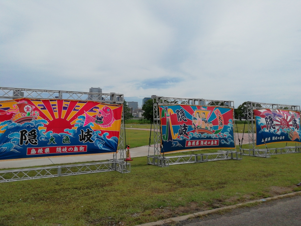 色々なイベント会場にもなっていますが、この日は、隠岐オンラインウルトラマラソンのリアルゴール地点が設置されていて、ウルトラランナーが隠岐の島の大漁旗のもとに集まっていました。- 旅行時期