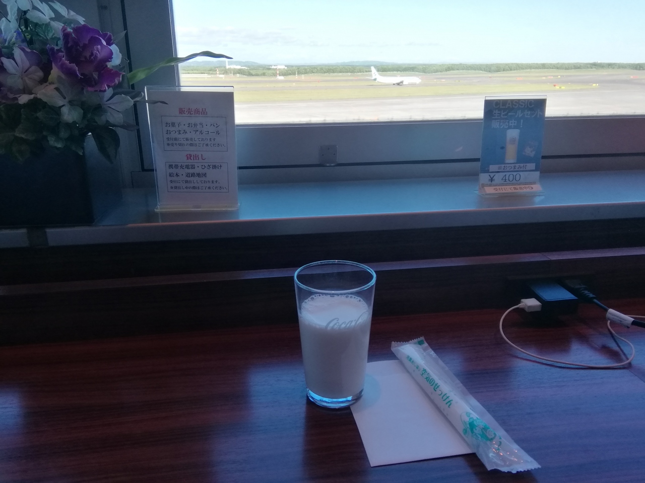 新千歳空港の3階にある制限区域外のカードラウンジです。場所がちょっとわかりにくいかもしれませんが、大空ミュージアムと同じフロアにあり、搭乗口フロアからエスカレーターに乗れば、たどり着きます。窓が広く滑走路に面しているので、飛行機の離発着が眺められます。無料のソフトドリンクを飲みながら、特に北海度の牛乳を飲みながら飛行機を見て楽しめました。