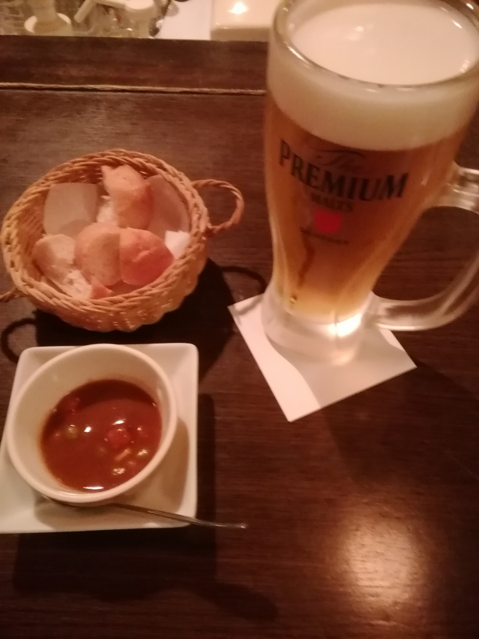 浜松町の貿易センタービル地下のレストラン街の一角にあるレトロ風の酒場です。モノレールで羽田空港に行く途中にちょっと立ち寄りました。店の名前からはワイン主体と思われますが、サントリー系列のお店ですので、ビールもサントリープレモルが飲めます。浜松町の喧騒でにぎやかな居酒屋もいいですが、こんなレトロな感じの酒場で、ちょっと、いっぱい飲んで、雰囲気を味わうのもいい感じです。