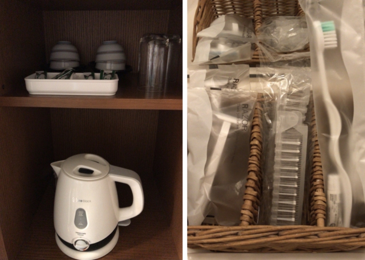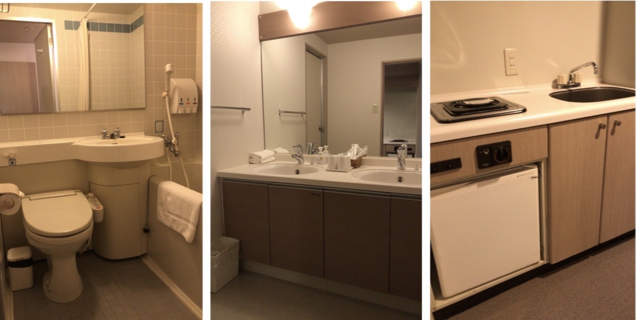 広々とした造りで、リゾートマンションのような雰囲気でした。部屋にはシンクとコンロが付いていますが、コンロは使用禁止で、電子レンジもないので、食事はレストランを利用するのが無難です。