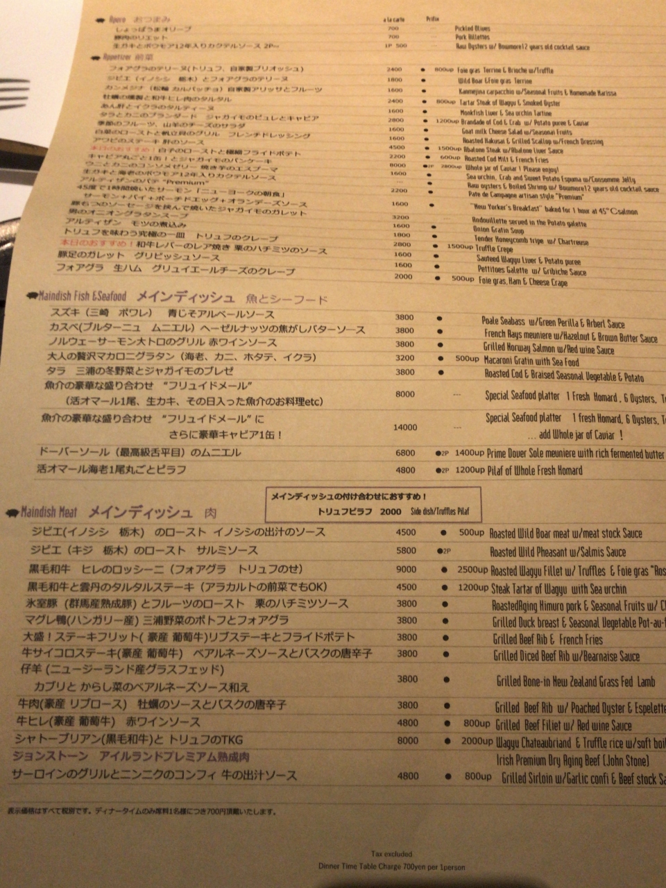 お料理はアラカルトかコースで、前菜2品とメイン1品を選ぶプリフィックスBコース(5,500円)にしました。メニューの種類がとにかく豊富です!予想を超える斬新なお料理は驚きとともに感動の美味しさでした♪