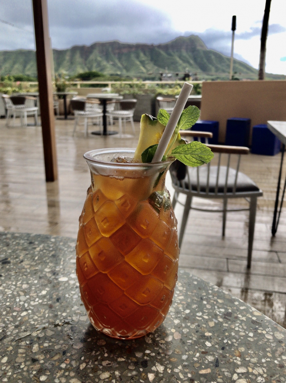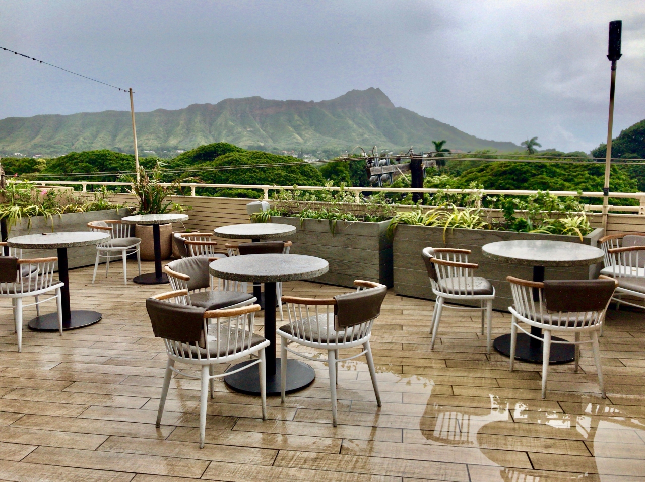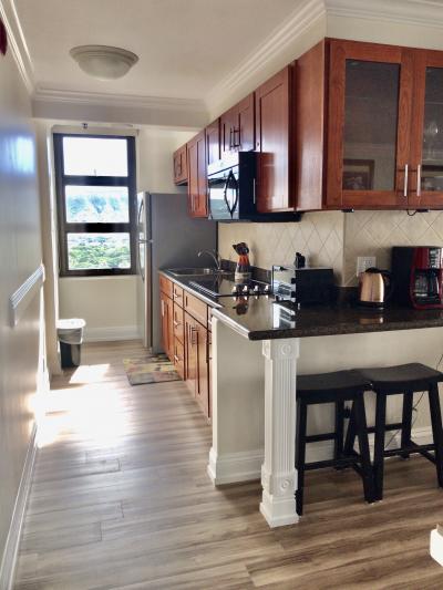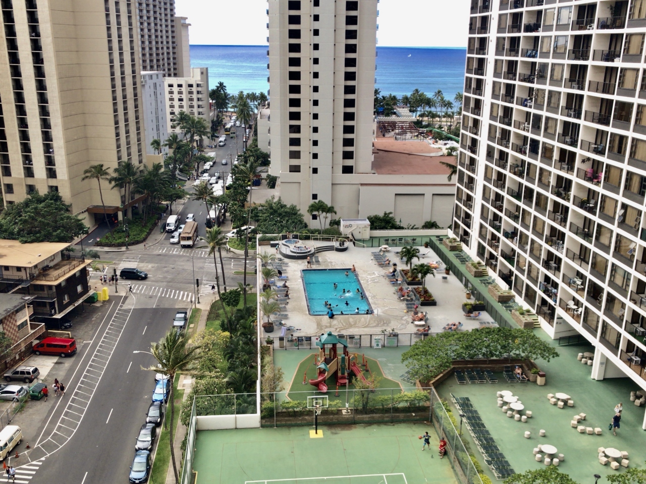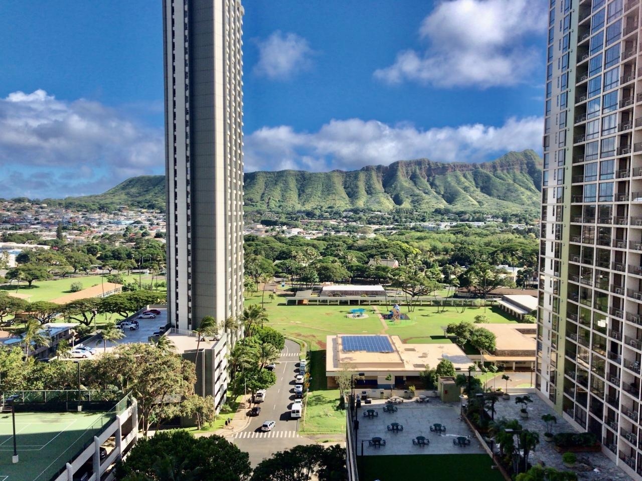 部屋からの眺めはパーシャルオーシャンビューですが、キッチン突き当たりの窓からはダイヤモンドヘッドが見えました。
