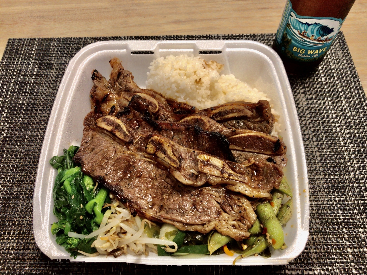 一番人気のカルビ・プレート($20.42)は骨つきカルビが4枚に選べるお惣菜が4種類、ライスが2スクープついてボリューム満点!甘辛いタレが染み込んだカルビは柔らかくて最高に美味しい♪