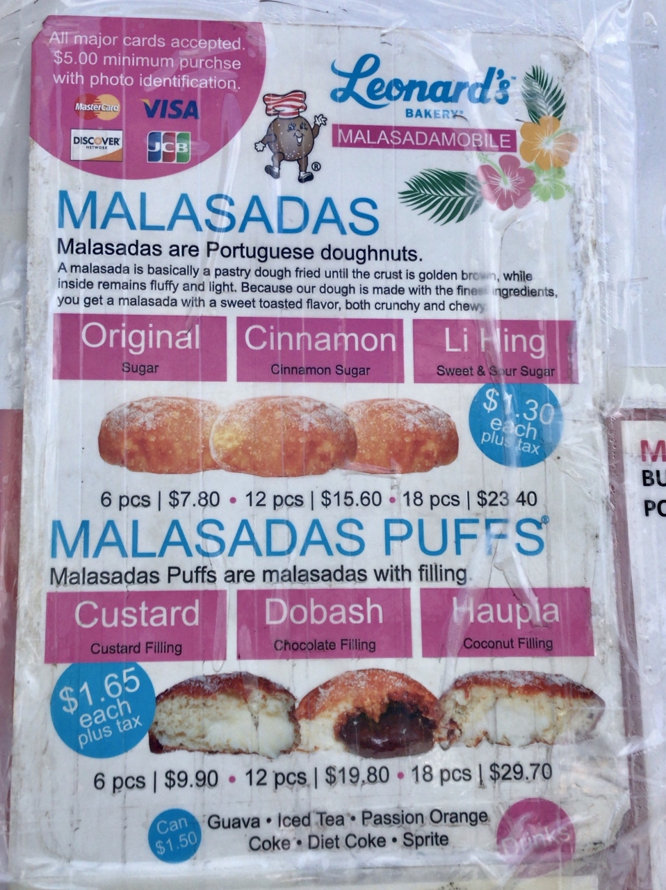 ここで買えるのはマラサダ($1.30)3種類とクリーム入りのマラサダパフ($1.65)3種類で、数人のお客さんの注文を受けてからまとめて揚げるので、アツアツの揚げたてが食べられます。注文から受け取るまで15分ぐらいでした。