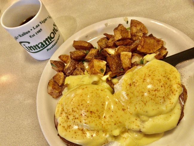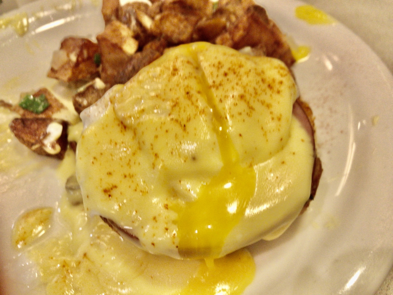 エッグベネディクトはフルサイズとハーフサイズがあります。トラディショナル エッグベネディクトのフルサイズ($14.75)を注文し主人とシェア。トラディショナルはマフィンの上にカナディアンベーコンとターキー、ポーチドエッグがのっていて、オランデーズ・ソースがかかっています。