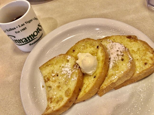 もう一品フレンチトースト($7.95)を注文。フレンチトーストはハワイアンスイートブレッドかサワードウ、ホワイトブレッドかホールウィート(全粒粉)ブレッドから選びます。酸味のあるサワードウを選んだのですが、ハード系のブレッドなので固めのしっかりとした食感で甘さ控えめ。ふわふわのフレンチトーストが食べたかったので、ハワイアンスイートブレッドにすればよかったと後悔しました。- 旅行時期
