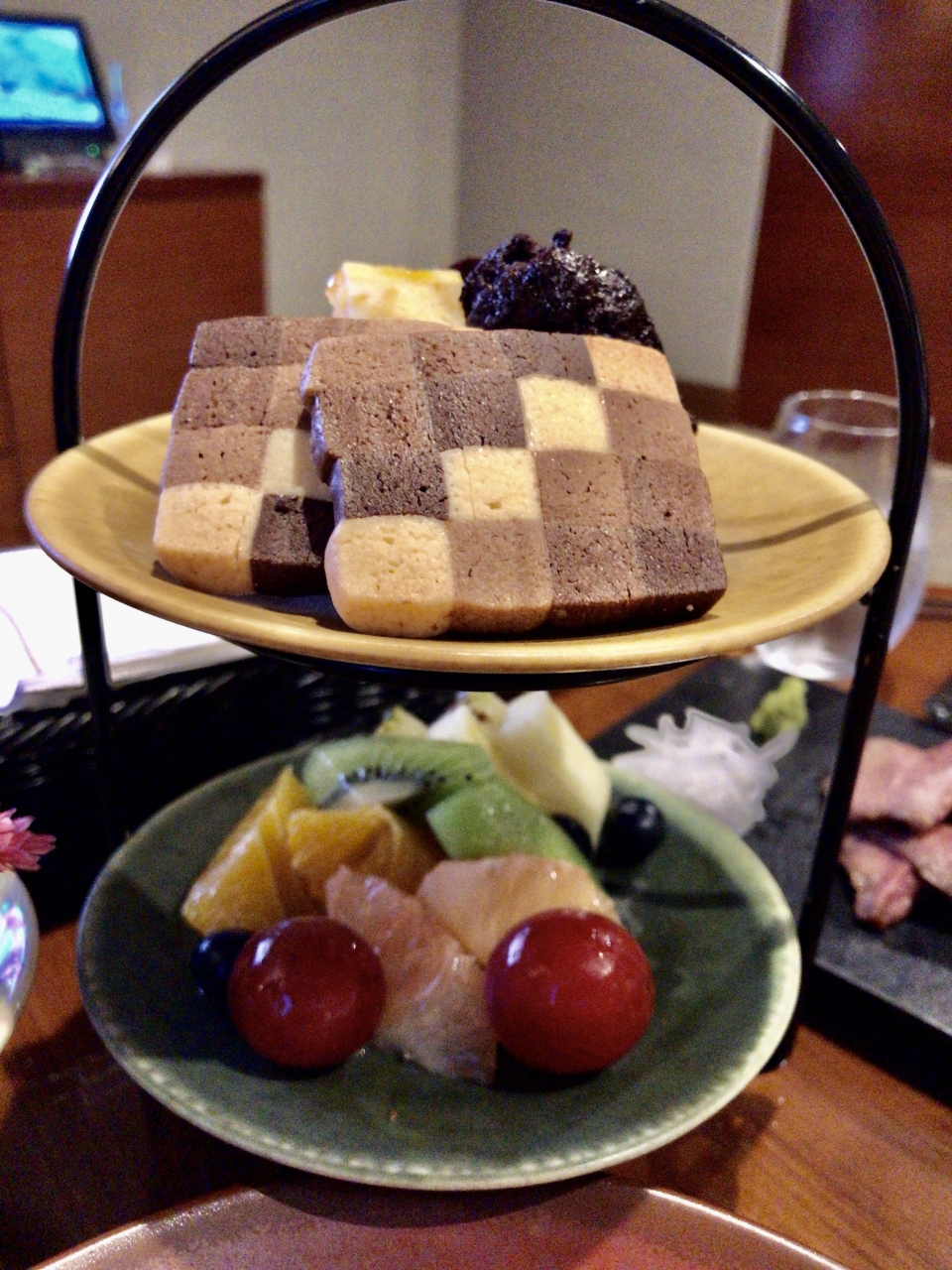 食事が一段落するとスタッフさんが8種類のデザートが入ったワゴンをゴロゴロと席まで押してきて、目の前で見せてくれてその場で盛り付けてくれます。これは楽しい演出でした♪デザートはコースとは別料金で全て500円です。