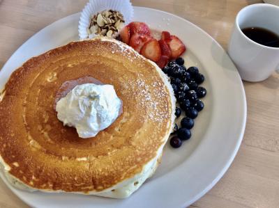 ホットケーキというネーミング通り、ふわっふわで素朴な味わいに塩バターのホイップクリームとシロップの甘みが絶妙のコンビネーション。フルーツやナッツで味変を楽しみました。