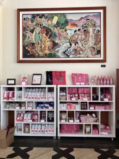 またお土産に喜ばれそうなホテルロゴ入りのピンクのボックスやパッケージに入ったチョコレートやクッキー、「サーフラナイ 」で大人気のピンク色のパンケーキがお家で作れるパンケーキミックスがありました。