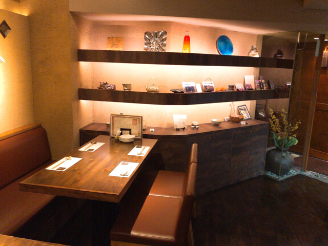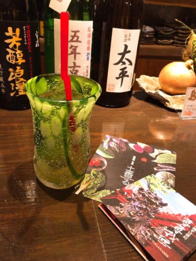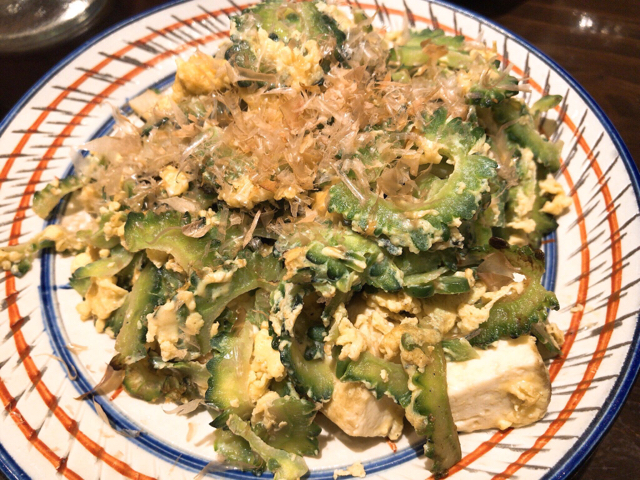 照明をやや落とした落ち着いた店内には店主さんが沖縄中を巡って集められたというこだわりのやちむんが飾ってあり、ここで使われている器やグラスにも個性豊かで味のあるやちむんや琉球ガラスが使われています。
