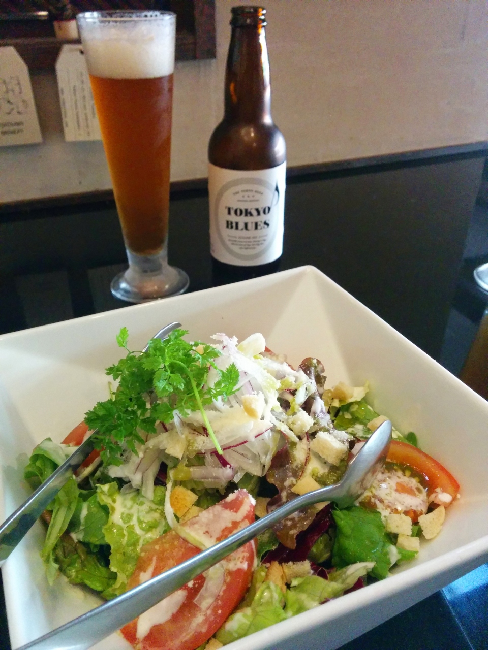 東京ブルースというペールエール。2015年4月7日デビューです。ポップの利いたフルーティでコクのある絶品です。福生のソーセージ盛り合わせと合わせると最高、4月29日に伺った時は、日替わりおすすめ品で、豚肉のビール煮込みを頂きましたが、この料理ともばっちりマリアージュしました。