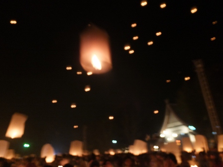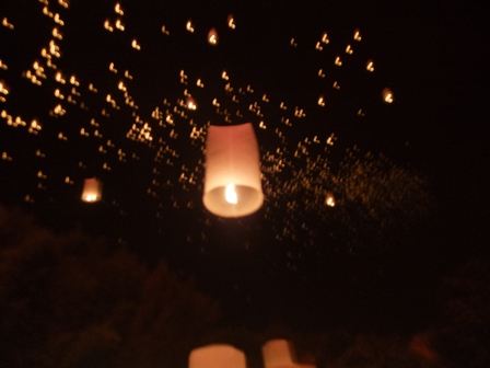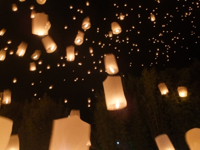 見えなかったけど、踊りがあったり、僧侶の説法やお経があり、天灯揚げは8時頃。