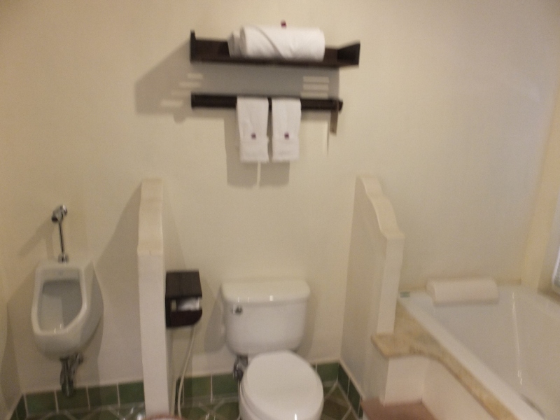バスルームが広く、トイレは洋式の他に男性用の小便器が設置されていました。シャワーブースに明かりがなく、カーテンを閉めると薄暗いのが難点。