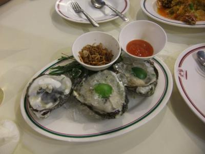 ここの名物はプーパッポンカリー(蟹のカレー炒め)ですが、メニューの中に生牡蠣を発見。友人たちは食べず、一人で注文して食べました。1個45バーツと高めですが、3個注文。少し小粒の牡蠣でしたがおいしかったです。特にお腹も異常なし。