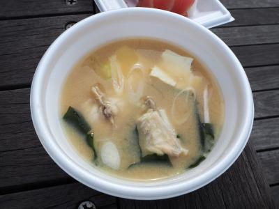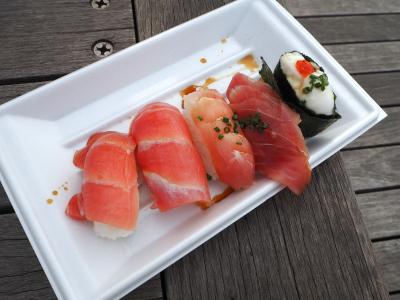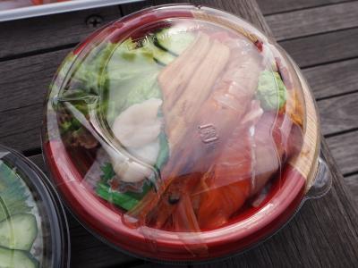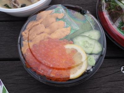 海鮮丼、ウニ・イクラ丼、バラで買ったお寿司、ふく汁を買ってボードウォークにあるベンチで食べました。