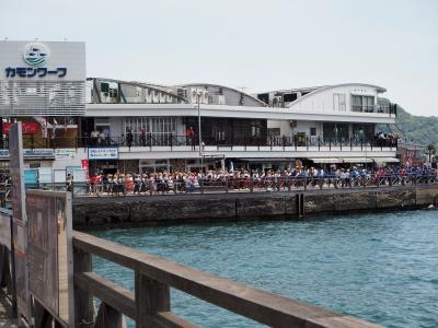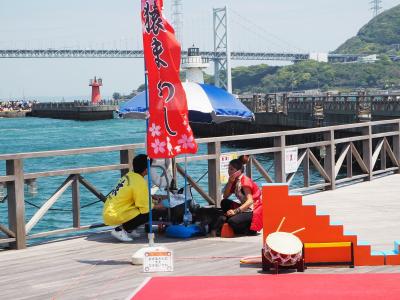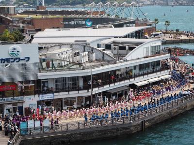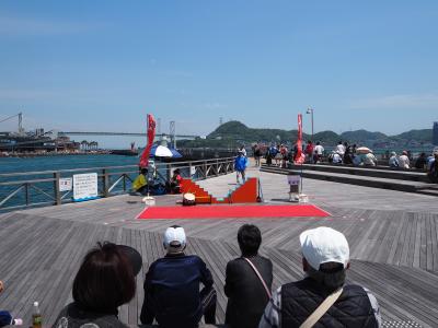 様々なイベントが各会場で行われていて、カモンワーフ前のボードウォークでは八丁浜総踊り、あるかぽーとでは猿まわし、関門海峡では源平船合戦(海上パレード)が行われていました。