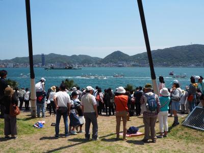 源平船合戦(海上パレード)は、鎧武者が乗り込んだ80隻あまりの船が、紅白の旗やのぼりをたなびかせて海上をパレードするものです。