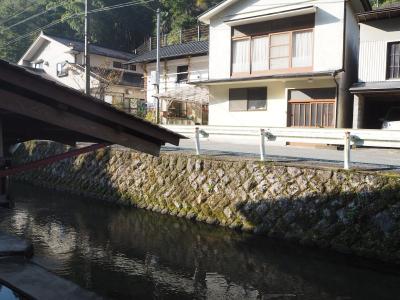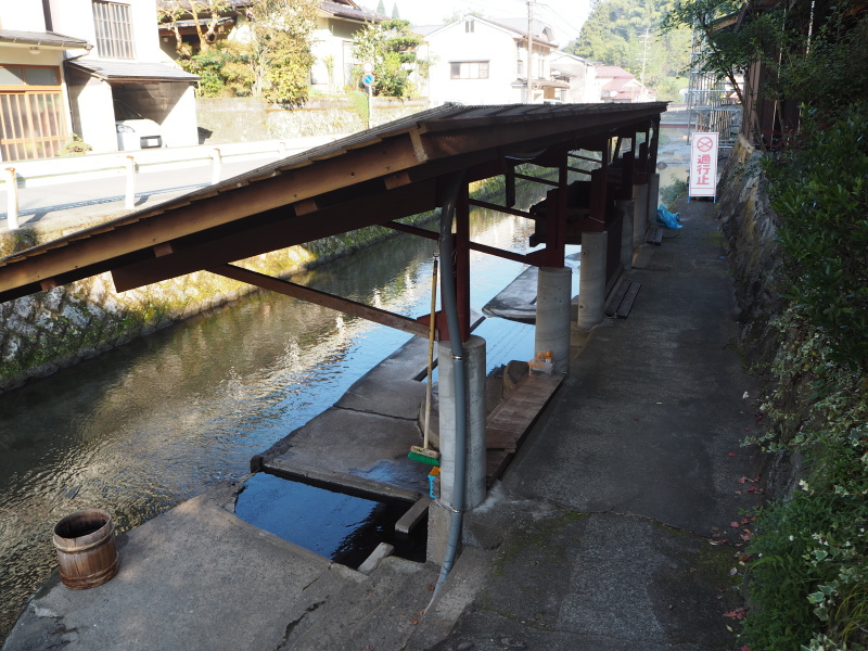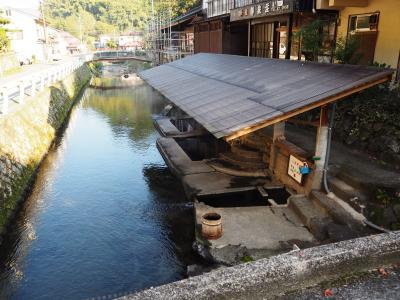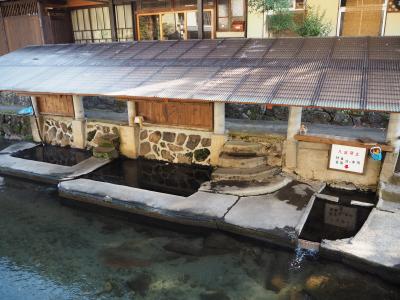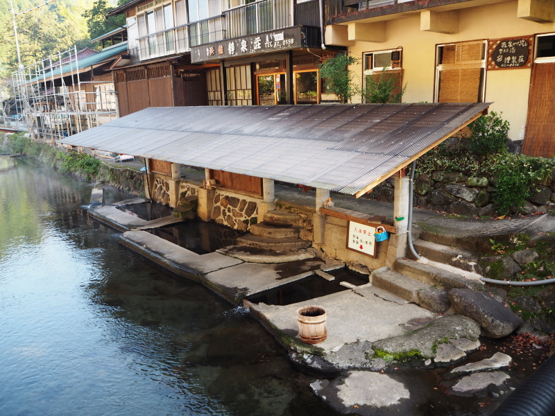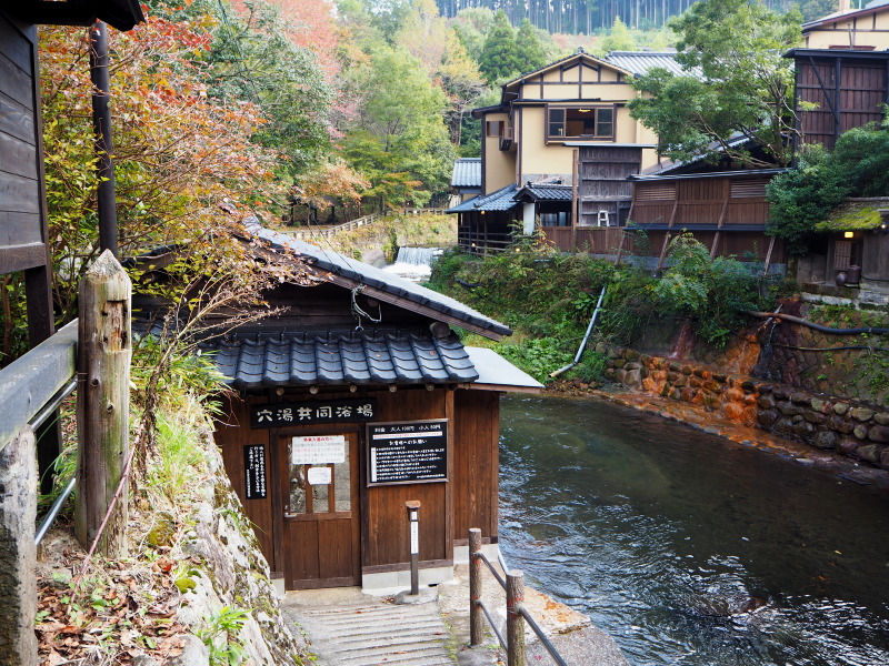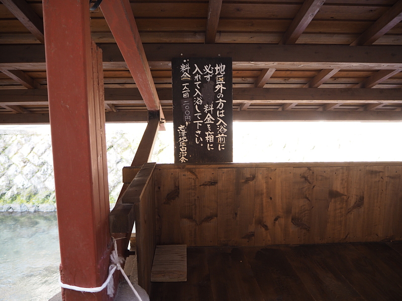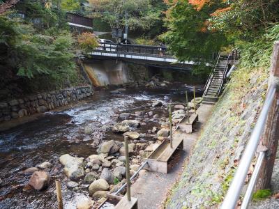 温泉街を散策しながらまるすず橋に到着すると、橋の階段を下りたところの田の原川沿いに共同浴場が見えます。