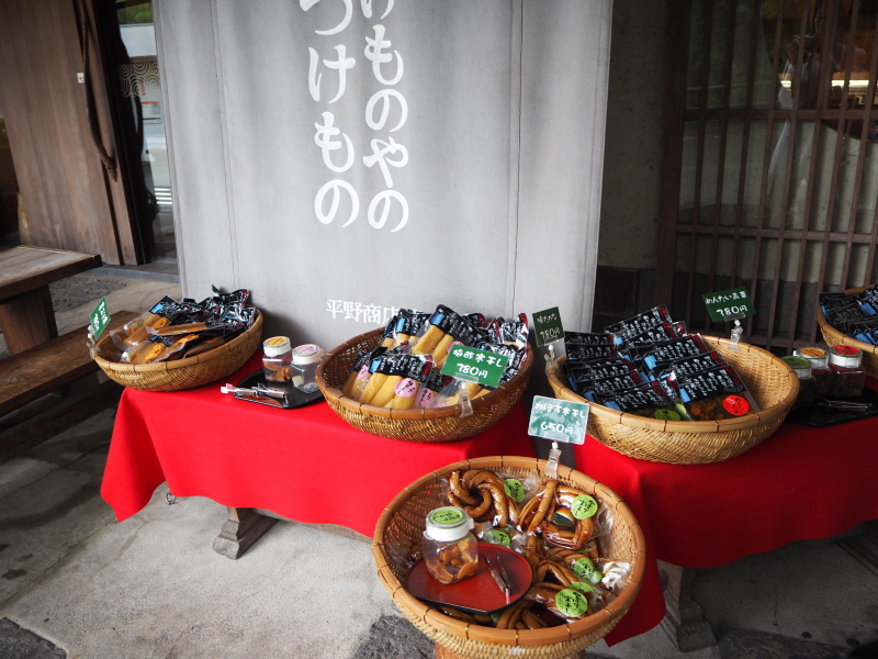 店の前にはかごに入ったお漬物が並んでいて、試食もできるようになっていました。
