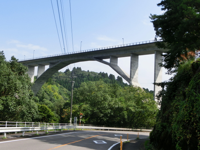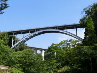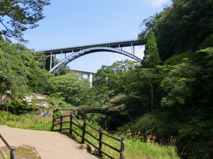 三代橋とは、神橋(石の橋)、高千穂大橋(鋼の橋)、神都高千穂大橋(コンクリートの橋)とそれぞれ異なる材料で建造された三つの橋のことで、高千穂峡へ向かっていると、この三代橋を写真におさめる事ができる場所にたどり着きます。