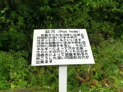 甌穴とは、河の底の岩にできる円筒形の深い穴のことで、ポットホールとも言われています。