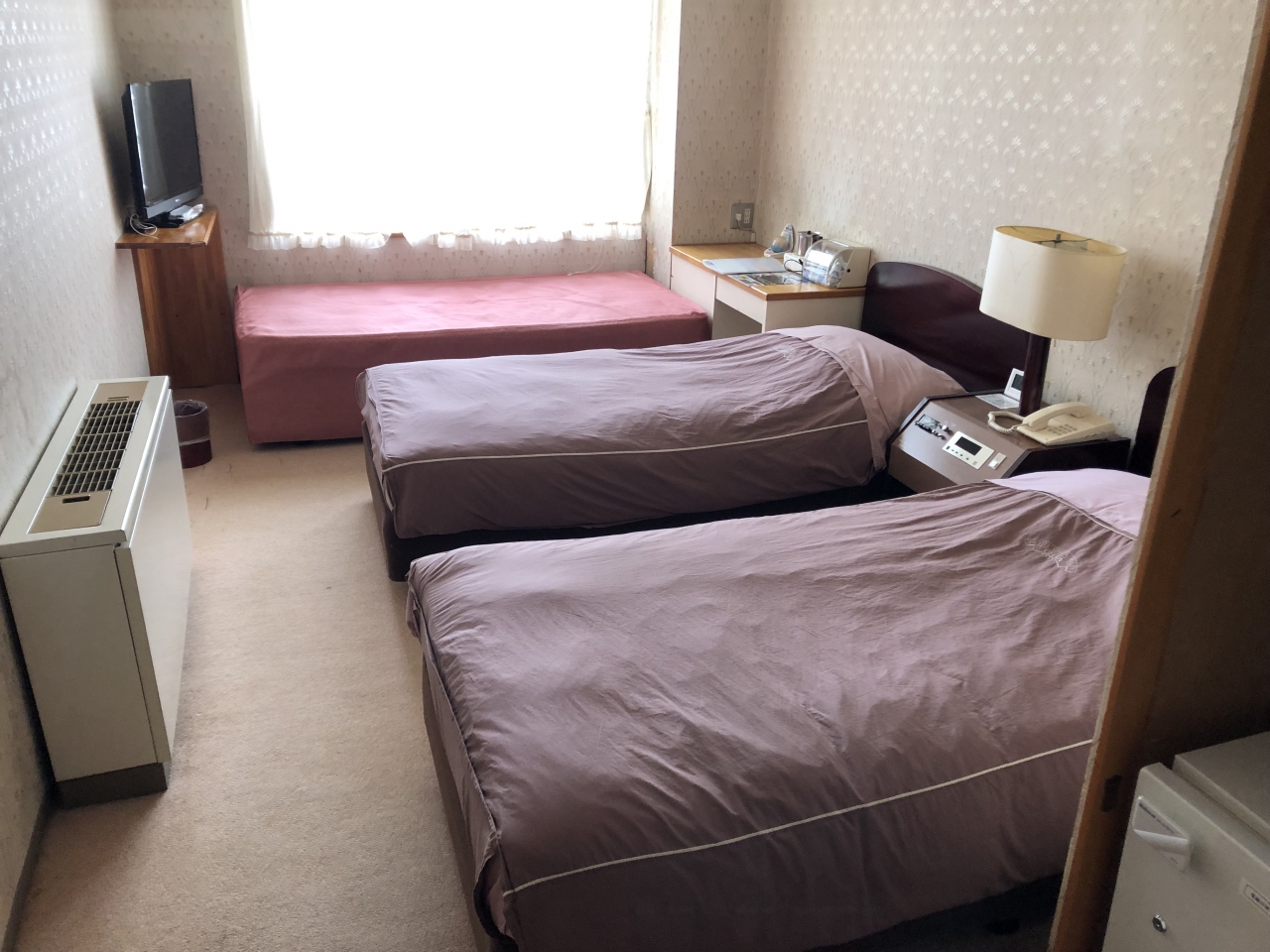 ツインの部屋は荷物を置くとギュウギュウでした。