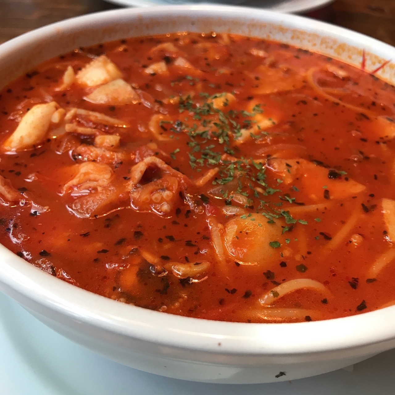 人気の真夜中のスパゲティは、ガーリックがきいたたっぷりのトマトスープに