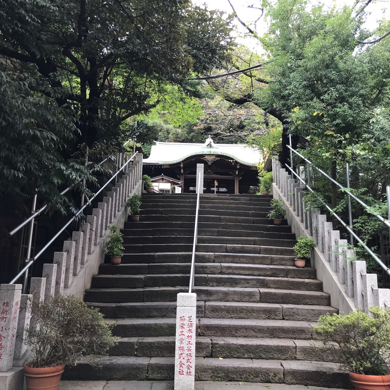 泉岳寺駅から徒歩7分ほどの場所です。第一京浜に面して鳥居があり、参道はビルの間にありますが、とても静かで八幡宮は厳かな雰囲気です。