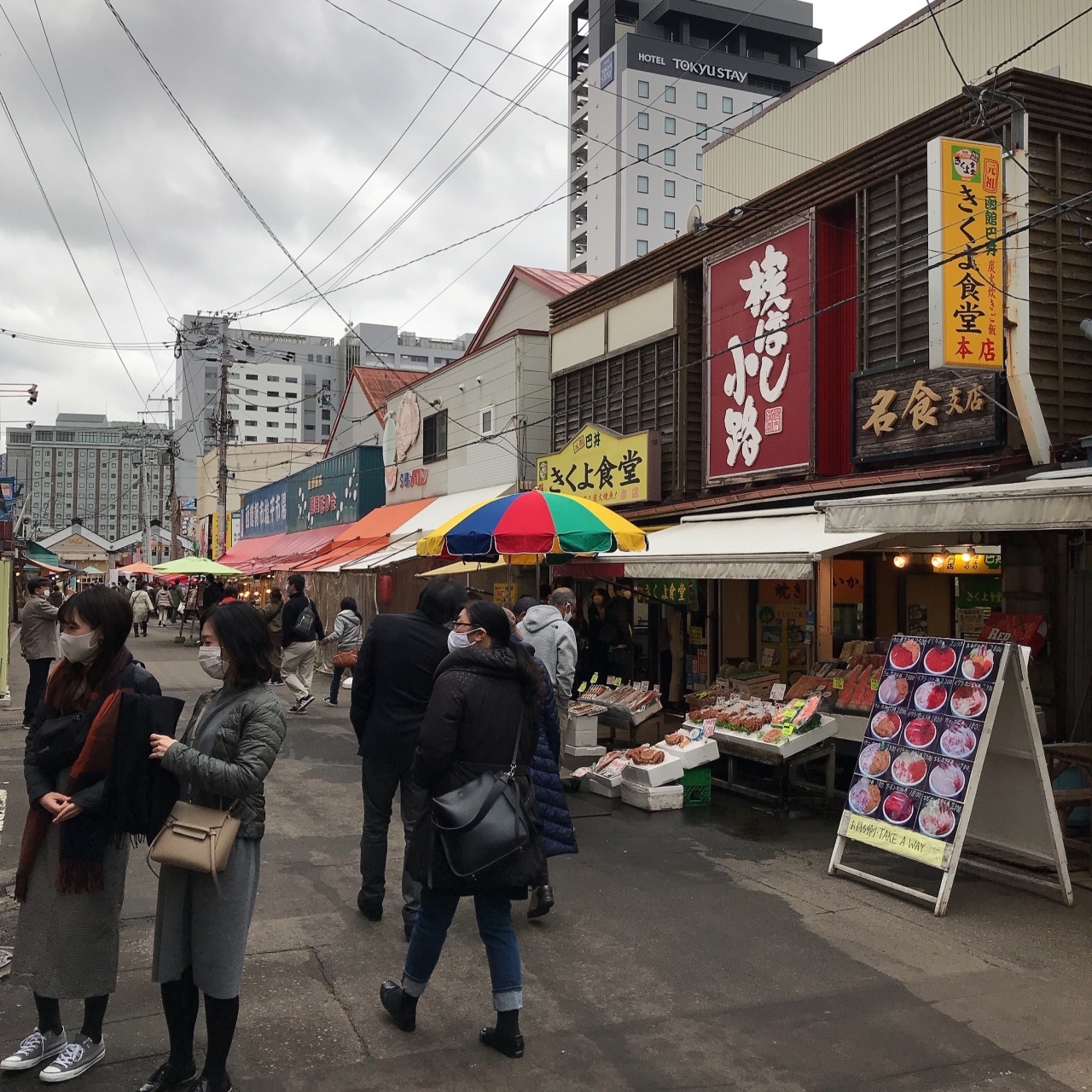軒先に並ぶ烏賊・蟹・鮭・メロンなど