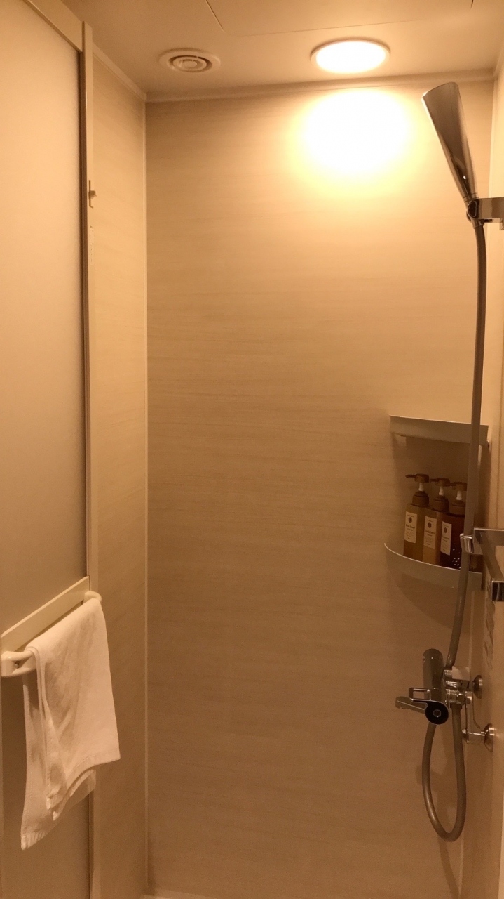 フロントと朝食会場は2階、大浴場は3階、部屋はシャワーブース。