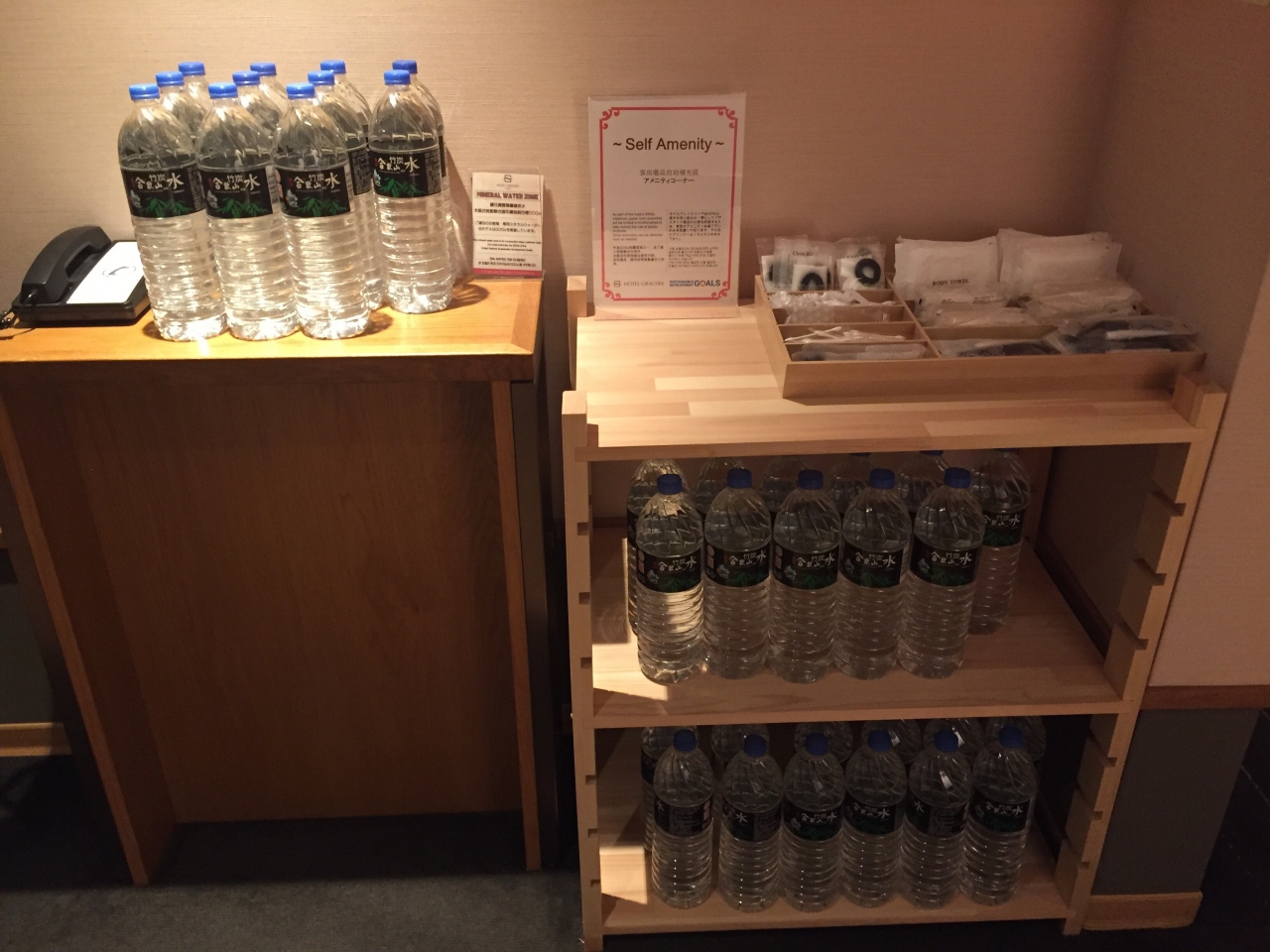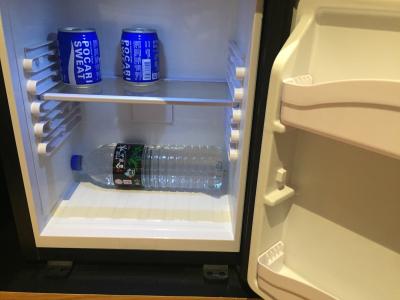 冷蔵庫には無料のポカリスエット、水はアメニティー置き場に2リットルボトルがたくさんあります。