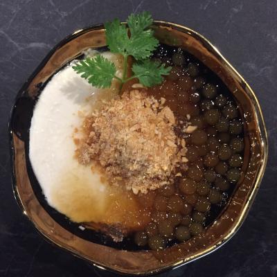 メニューはタピオカ入りの麥芽糖花生粉圓豆花、もう1つは桃の樹脂、桃膠入りの麥芽糖花生桃膠豆花です。- 旅行時期