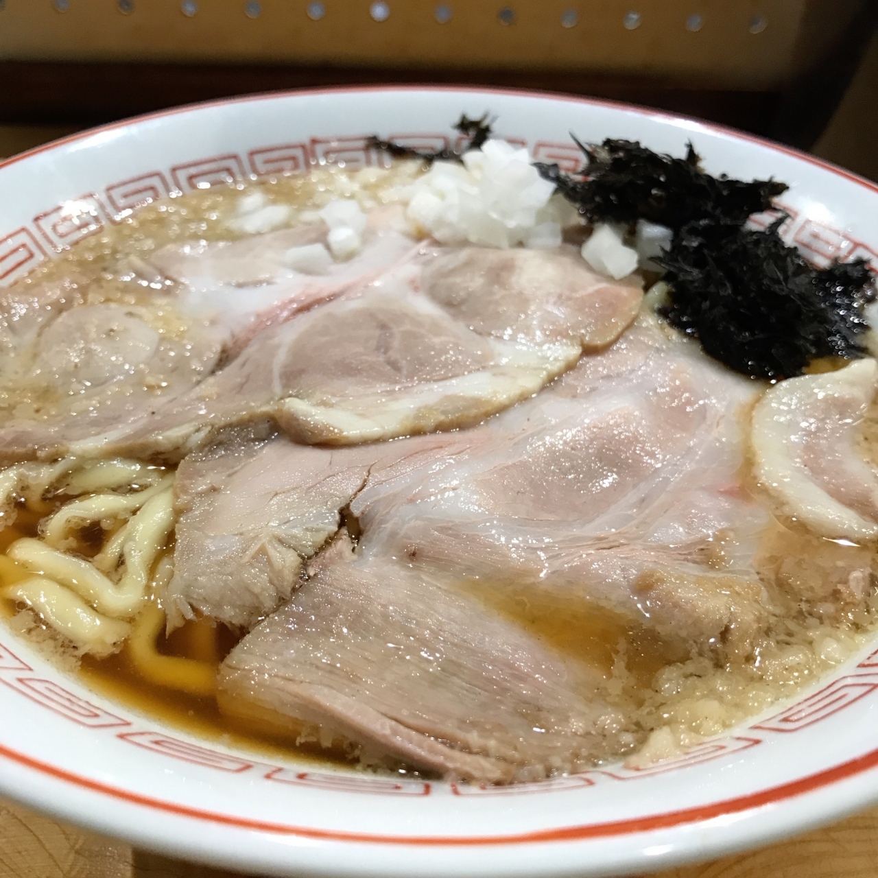 背脂、刻み葱、岩海苔が煮干しベースの醤油スープに素敵なアクセントを与えています。