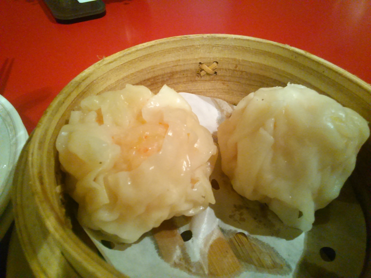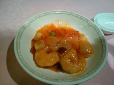 えびのトマトソース、蒸し茄子のショウガソース、海老シュウマイ、デザート、一人一品ずつ麺や炒飯など、しょうこう酒等々。