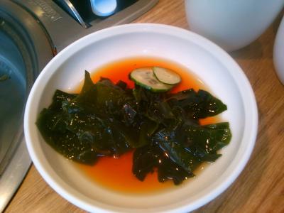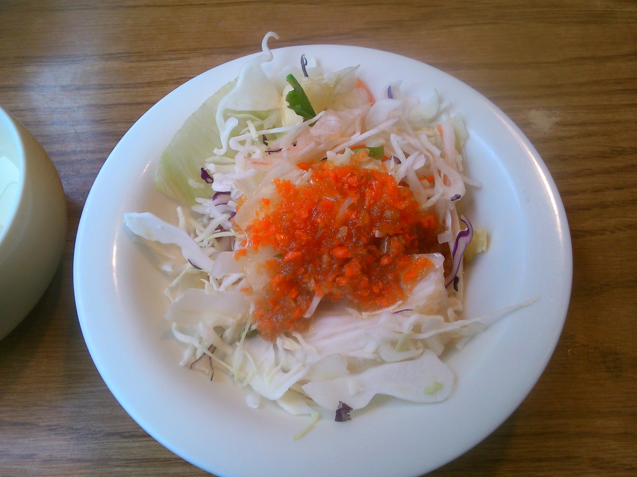 おかずは、キムチ、マカロニサラダ、ワカメとキュウリの酢醤油、玉ねぎの甘酢醤油、サラダ。(写真上げられませんでしたが大根の酢漬けも出ました。)