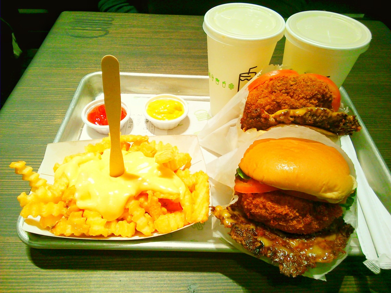シャックスタック(マッシュルームにチーズが挟まってて揚げてあるもの)とチーズフライ(フレンチフライのチーズがけ)のレギュラー、レモネードを注文。