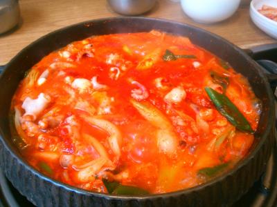 おかず(バンチャン?)にはキムチ3種、トッポキが運ばれてきました。こういうのって「上がり」ますね♪