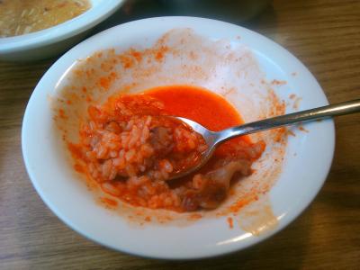 赤いので辛そうですが魚介の出汁で旨味が増し辛さがマイルドになります。赤い醤(ジャン)もそこまで辛くはないのかもしれません。