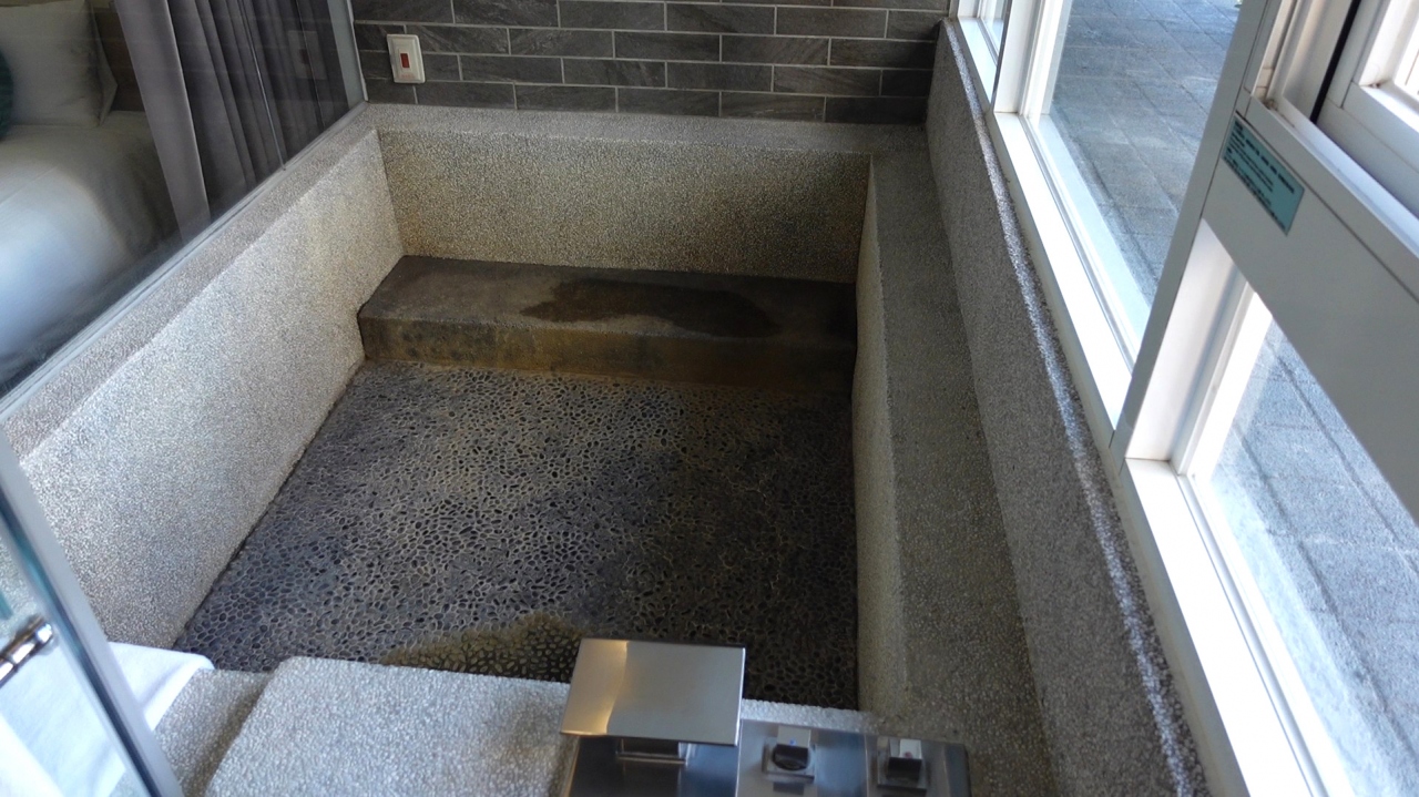 客室風呂は洗い場が独立した日式で、3人は入れるくらいの大きなお風呂で源泉かけ流しを楽しめました。お湯の方は柔らかく湯冷めしにくい大変良いお湯でした。