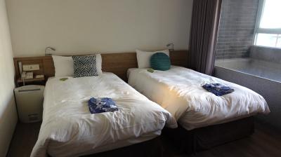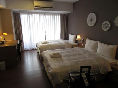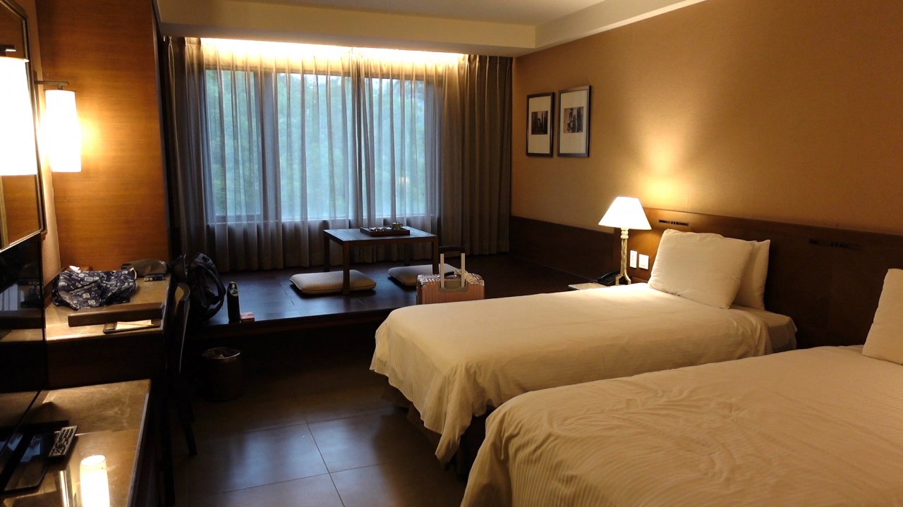 客室はツインルームをを選択しましたが、グレードアップしてくれたようで、写真とは違い広い部屋を案内されました。設備はセキュリティBOX、冷蔵庫、浴衣、ミネラルウォーター、ポット、茶菓子と日本の旅館のように充実していました。