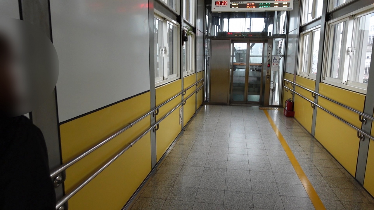 駅構内の橋上連絡通路にはエレベーターがあり、バリアフリー化されていました。